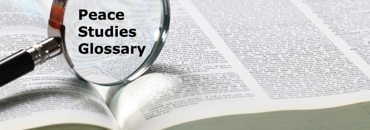 This peace studies glossary was developed by Joanie Connors. Peace Studies’ courses are challenging to students who have been brought up with limited worldviews and right/wrong thinking. Glossaries are important for students of varying backgrounds to be on the same page in studying any subject, but they are especially needed for courses that challenge status quo thinking. In addition to covering generally accepted terms in peace and conflict resolution, this glossary includes the systems perspective and interpersonal science.