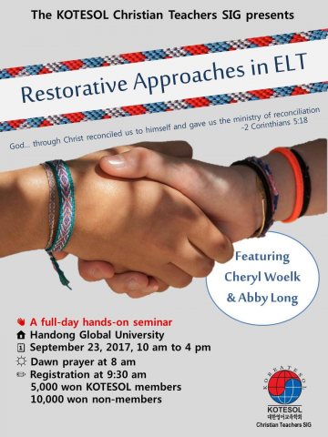 Language for Peace contributors Cheryl Woelk and Abby Long are leading a workshop as a Christian Teachers’ Symposium. It will be a full day hands-on workshop on Restorative Approaches in ELT at Handong University on September 23, 2017.